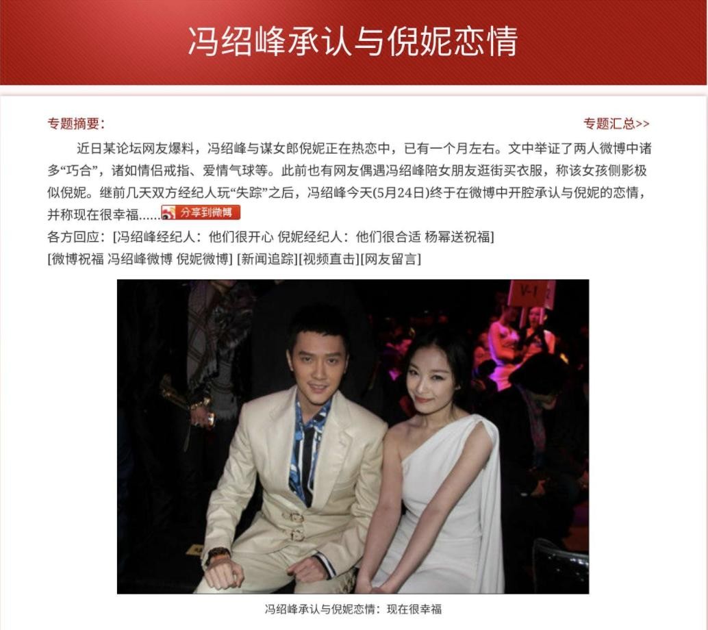 倪妮和冯绍峰相恋3年,就在大众都认为倪妮与冯绍峰快要修成正果时,冯绍峰却删除了与倪妮相关的微博。