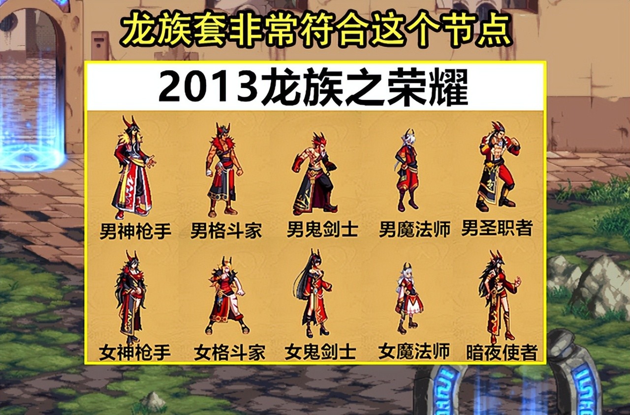 第二套上架可能性比较高的是龙族荣耀套,这套是13年上架的国庆时装,套装风格也是cos类型,其中暗夜使者、鬼剑士cos的火龙、男女枪cos的是金龙、男女格斗cos的是青龙、男女法师cos的是黑龙,男圣职cos的是巴卡尔,这套虽说颜值一般,但是在这个节点推出非常合适,因为在9.22版本就上线军团本了。
