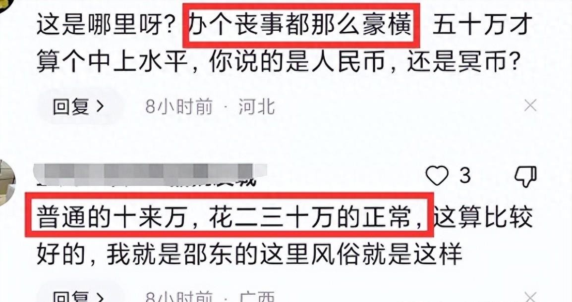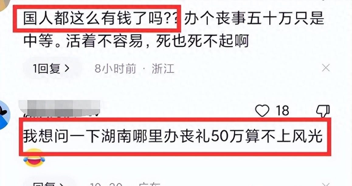 画面显示葬礼过于喜庆,与正常的葬礼氛围不符。在网友的评论中,有人表示50万的葬礼并不寒酸,湖南当地的葬礼普通的十来万,