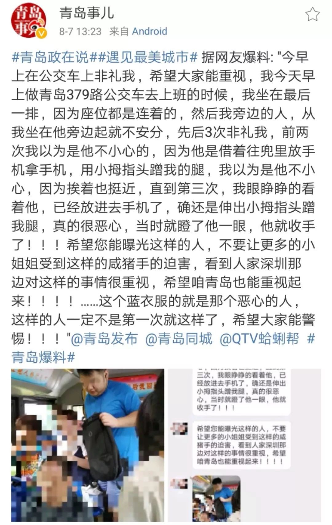 警惕!青岛379路公交惊现“咸猪手”!三次非礼乘客,还是惯犯……