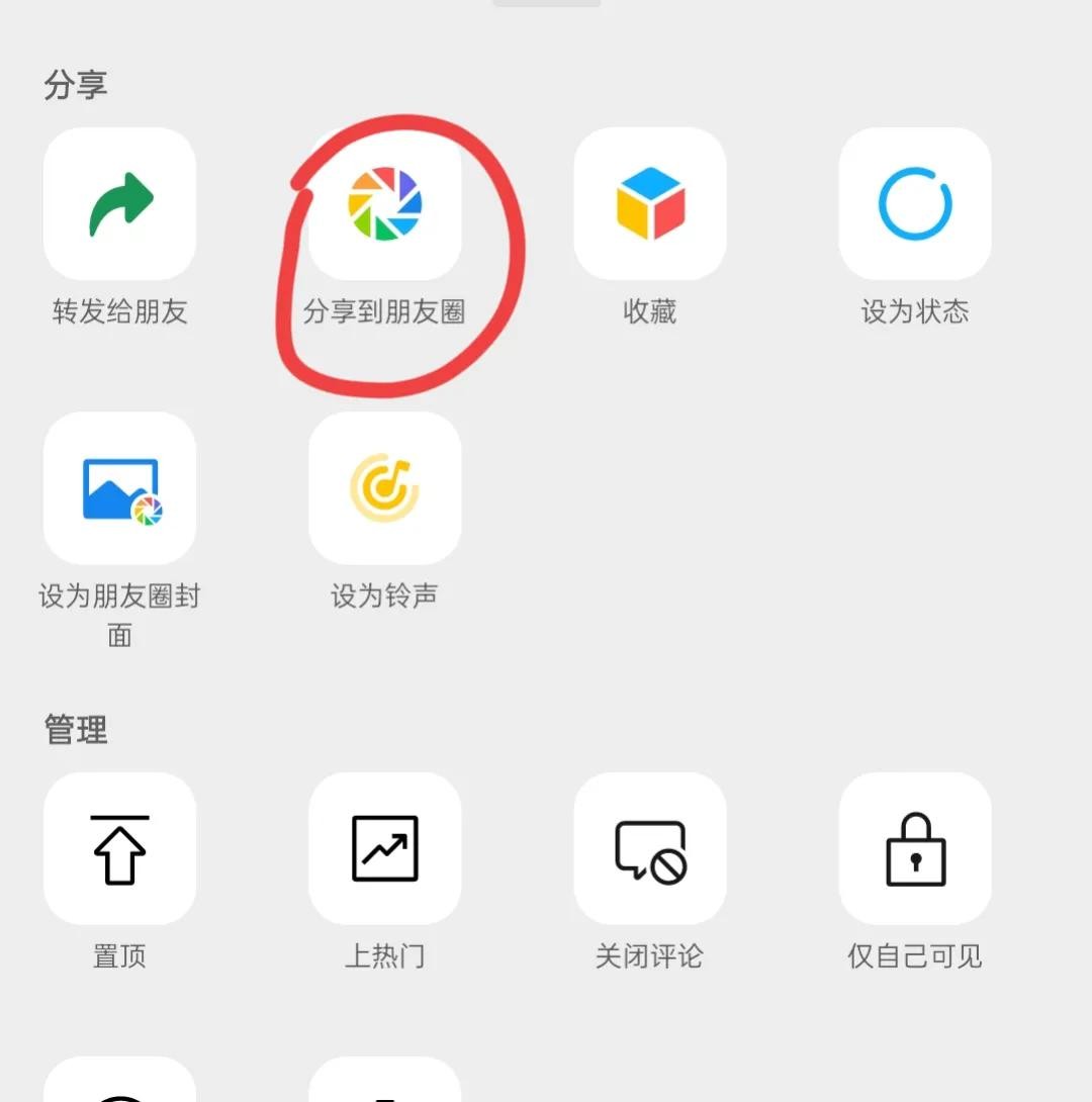然后选择这里的转发,我们在这里找到分享到朋友圈的选项,(如上图所示)