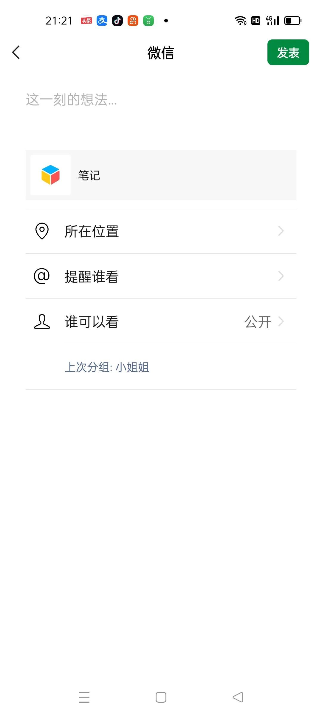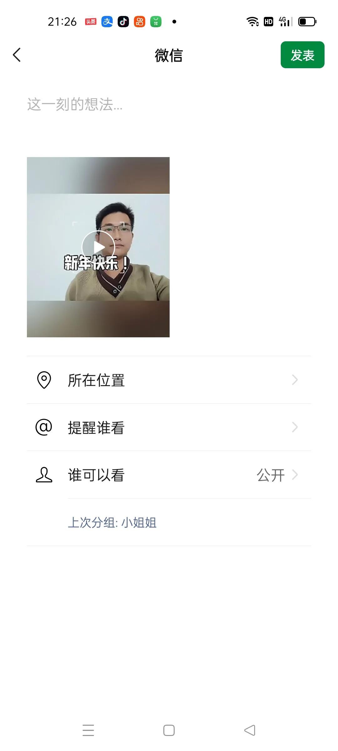 跳转到这个界面之后就和我们正常发布朋友圈是一样的,我们点击发表就可以了,那么这只是第一种方法,(如上图所示)