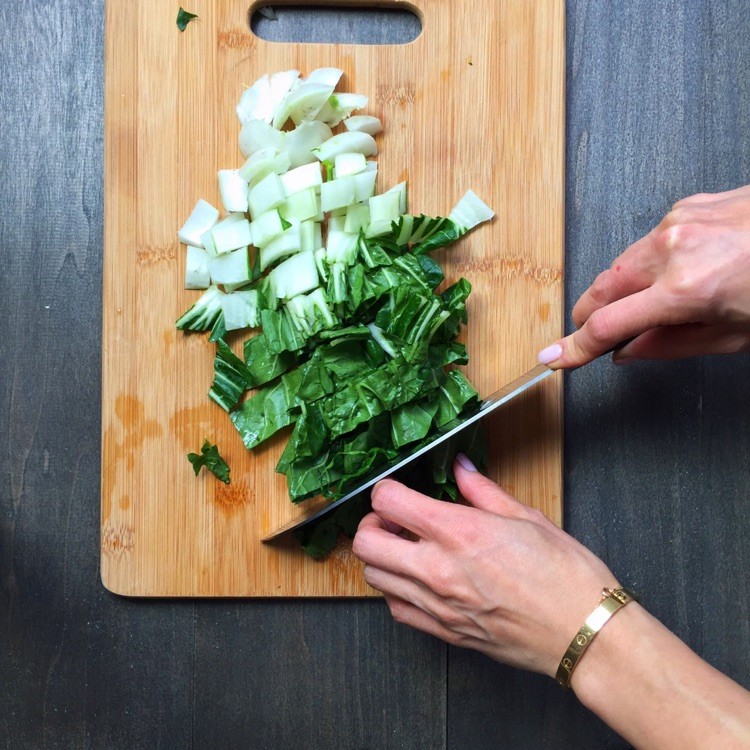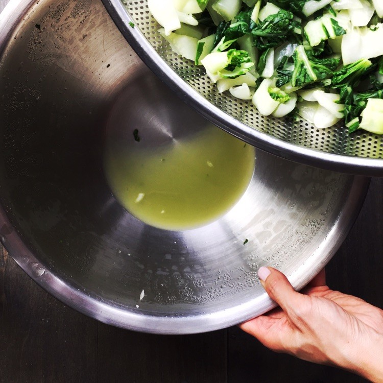 4、青菜沥干水分后将其放入料理机,或者用刀手工剁碎也可以