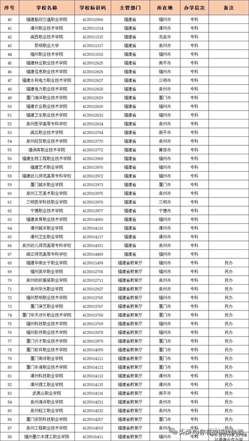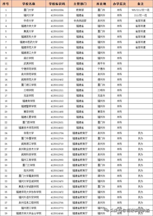 根据教育部最新发布的高校名单(截止至2024年6月20日),福建省高校共计有88所,其中本科39所,专科49所。