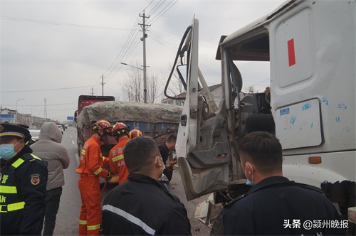 事故路段又出事故,水泥罐车追尾半挂货车,司机被困,事发安徽阜阳