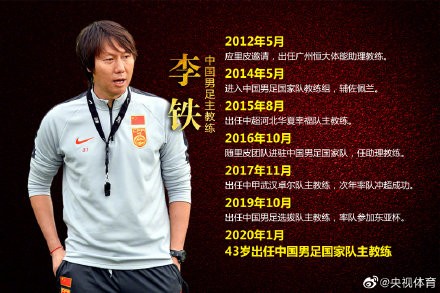 【李铁执教经历:恒大起步 43岁执掌国足】球员时代,李铁是国足中场防守屏障。2012年5月,他应时任恒大主帅里皮邀请,成为恒大体能助理教练,正式开启教练生涯。2014年5月,首度进入国足教练组,辅佐佩兰。随后又接连挂帅河北华夏、武汉卓尔两支俱乐部,并率领卓尔冲超成功。期间,他还曾跟随里皮团队,担任国足助教。去年10月,李铁出任国足选拔队主帅,率队征战东亚杯,取得1胜2负的战绩。今天,李铁正式成为国足主帅!