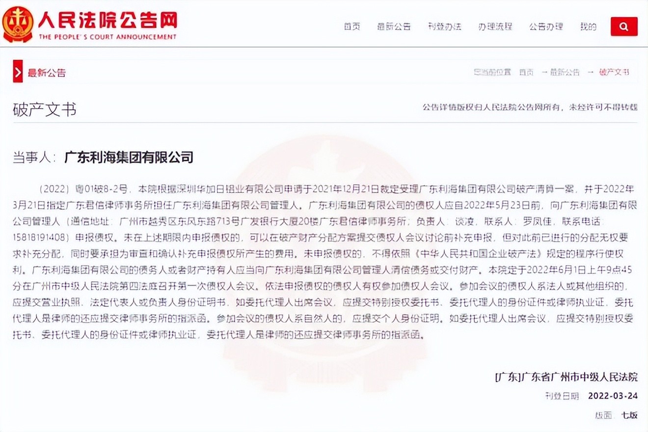 乐居新媒体 广州讯 乐居新媒体获悉,3月24日,人民法院公告网发布广东利海集团有限公司破产文书。