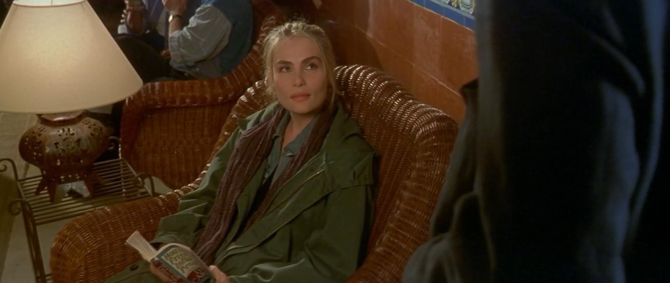 这个风情万种的女人是来和卡索做交易的。她希望卡索把书还给自己,而自己也会给卡索一笔相当大的报酬。卡索的下意识让他感到此事绝非那么简单,他拒绝了。并开了一个玩笑,他说在这种情况下,如果是在电影中,一般抱着这样目的而来的女人的长袜中都藏着一把枪。
