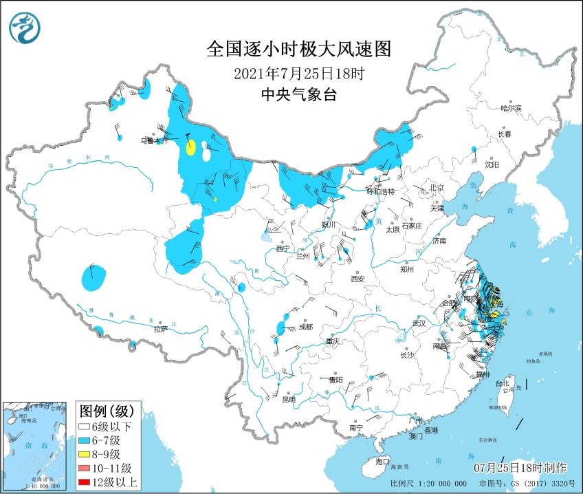 从18时的实况来看,上海、江苏东部沿海、浙江东北部等多地出现了6-7级大风,局地更有8-9级风出现!