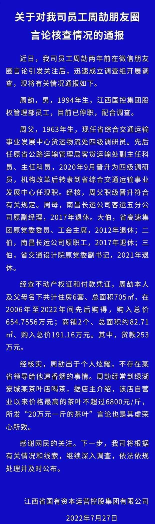周童鞋花式炫富火了之后,江西国控通报立马给出了通报,让周劼停职了,并表示其父亲的晋升符合有关规定。