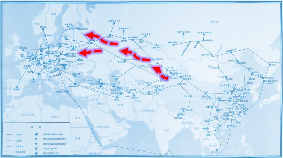该线路绕开里海和黑海,虽然线路较长,但属于纯铁路运输,稳定性较好。