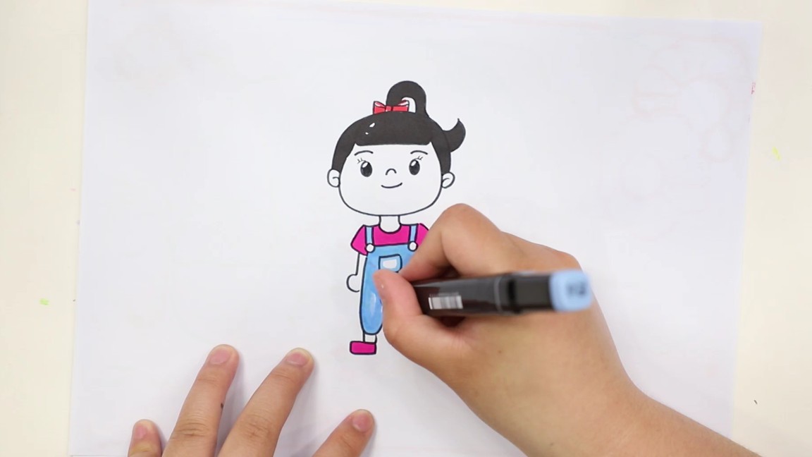 ①画女孩子,画上大眼睛和五官,画上蝴蝶结和头发,画上背带裤;