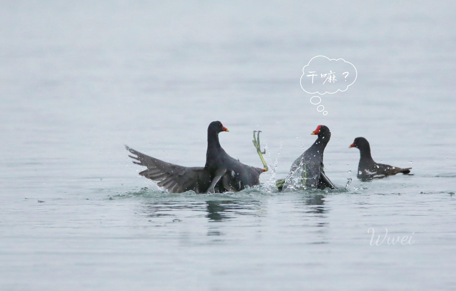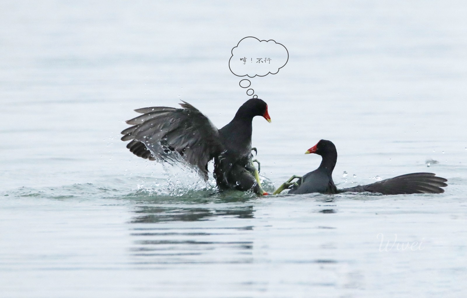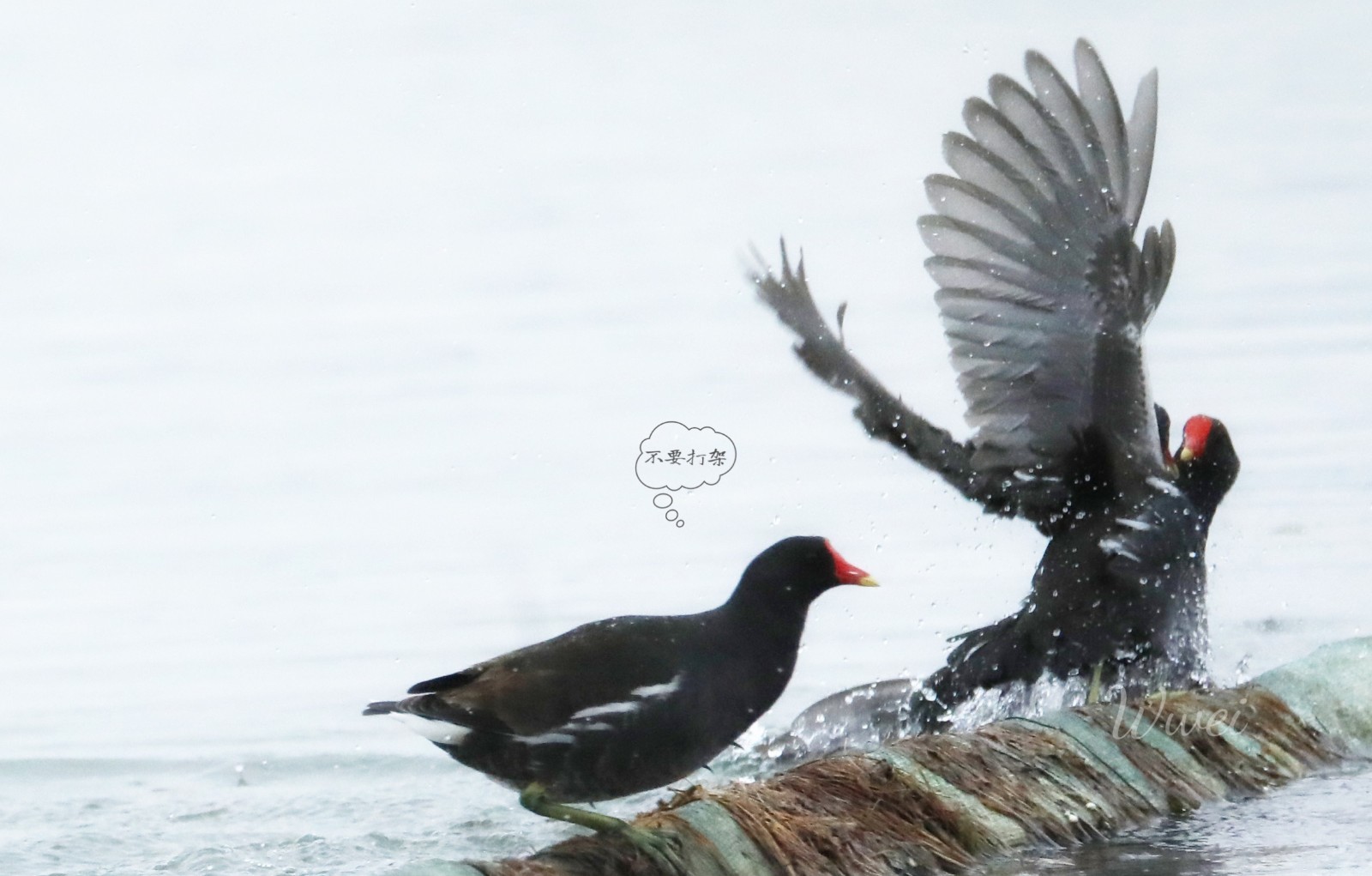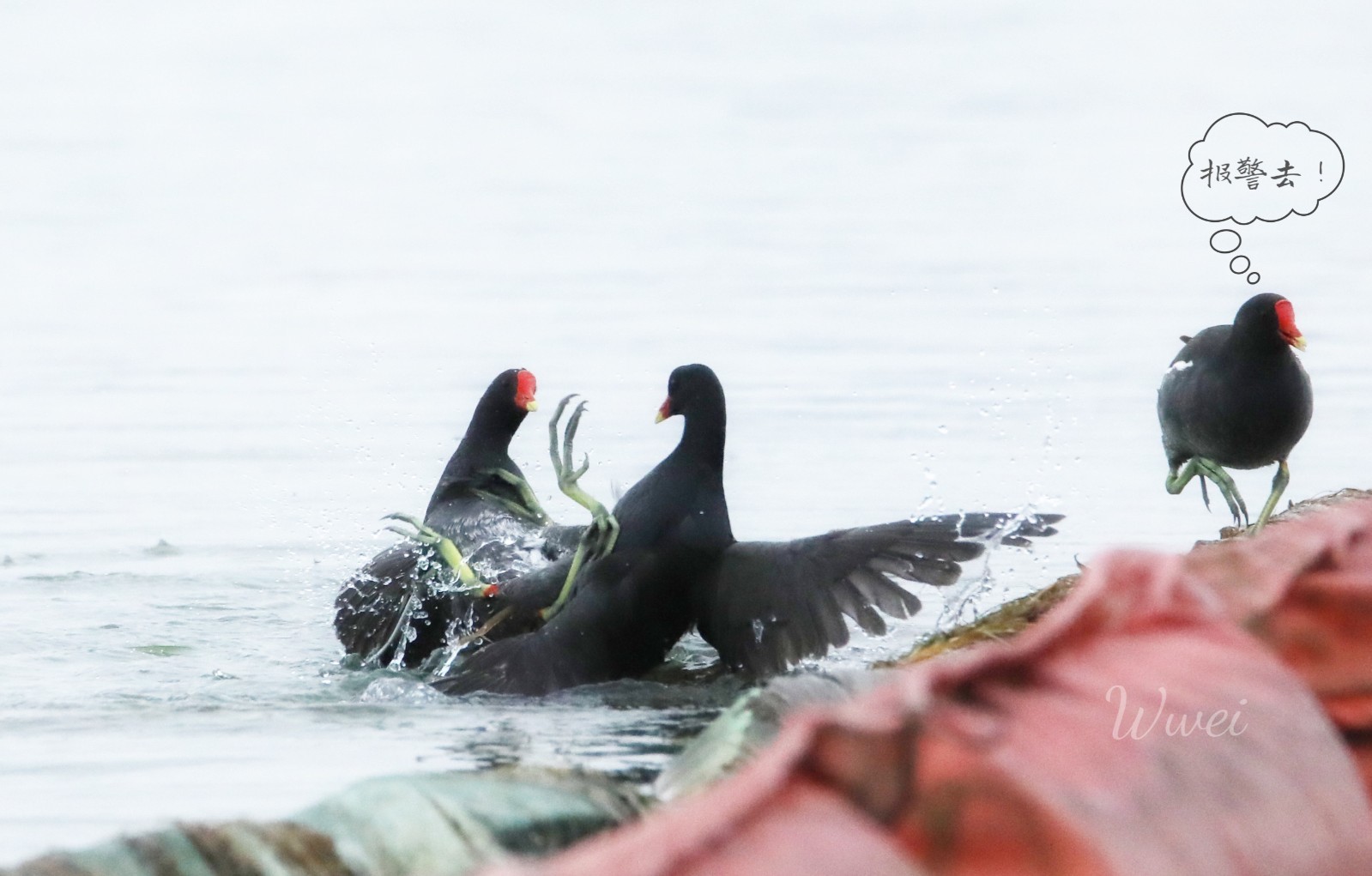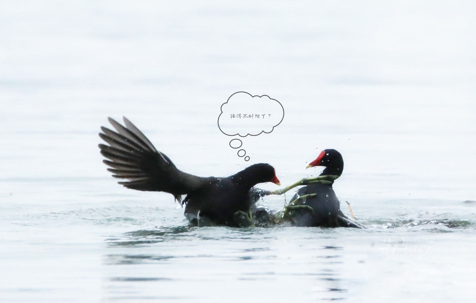 摄影师伍薇,在湖边拍下了这组精彩的图片,两只黑水鸡在水面“打斗”正欢,似乎是“谈情说爱”前的争抢大战。