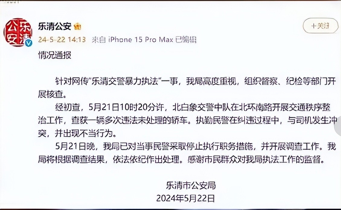 "浙江乐清警方对涉事交警采取停职措施,回应‘暴力执法’争议"