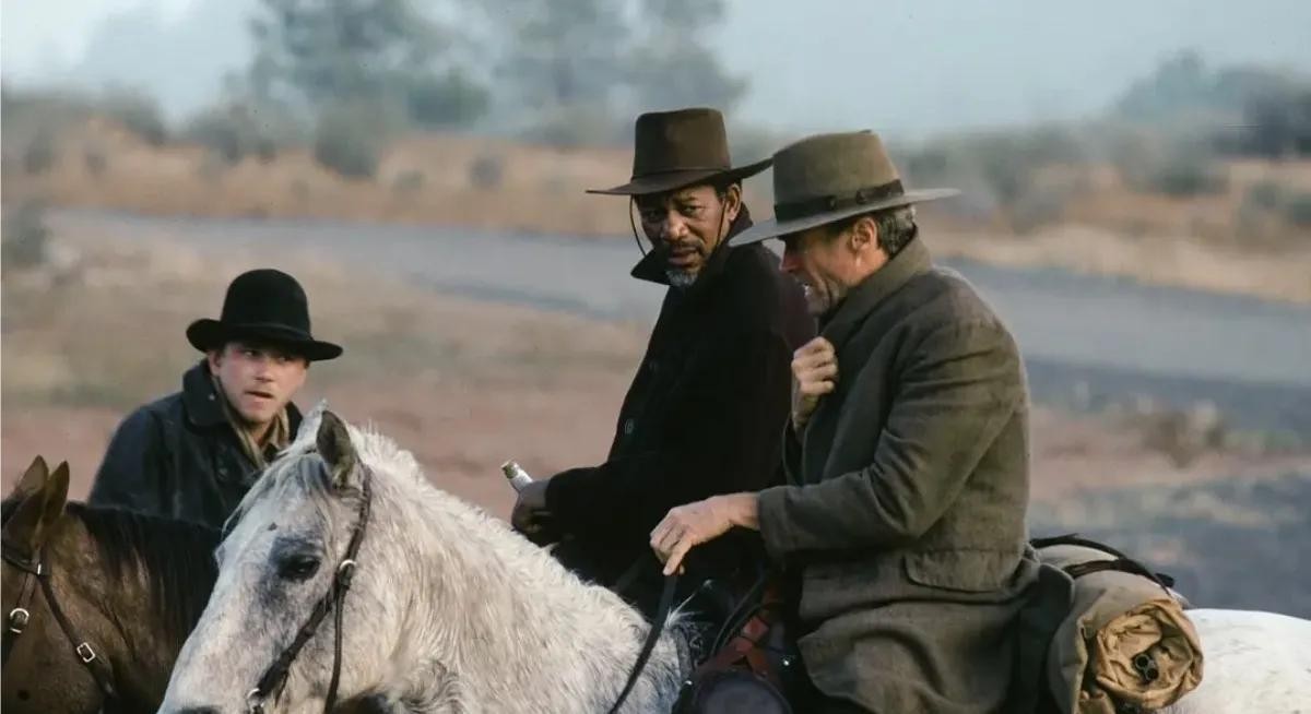 1992年美国导演克林特.伊斯特伍德执导西部动作片。克林特.伊斯特伍德与吉恩.哈克曼,摩根.弗里曼,杰姆.沃尔福特等领衔主演。摩根.弗里曼片中饰正直勇敢的老牛仔内德.洛根。该片获得第65届奥斯卡金像奖最佳影片。
