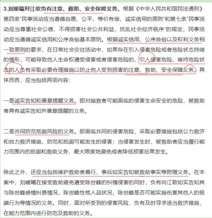 (2)一审法院认为刘暖曦与江歌双方形成一定的救助关系,“作为危险引入者和被救助者,刘暖曦对江歌负有必要的注意义务及安全保障义务”。