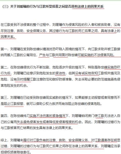 焦点问题主要涉及三项内容结论:一是刘暖曦对江歌负有注意、救助、安全保障义务;二是刘暖曦对江歌遇害存在过错;三是刘暖曦的行为与江歌所受损害之间存在法律上的因果关系