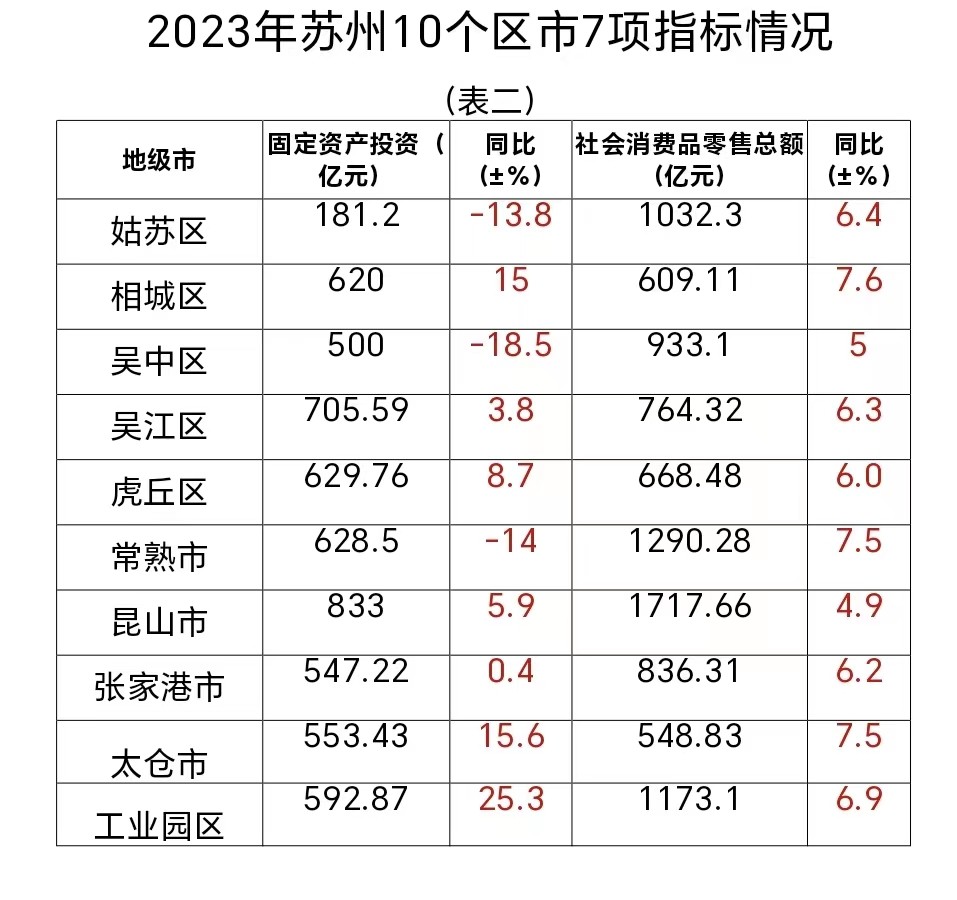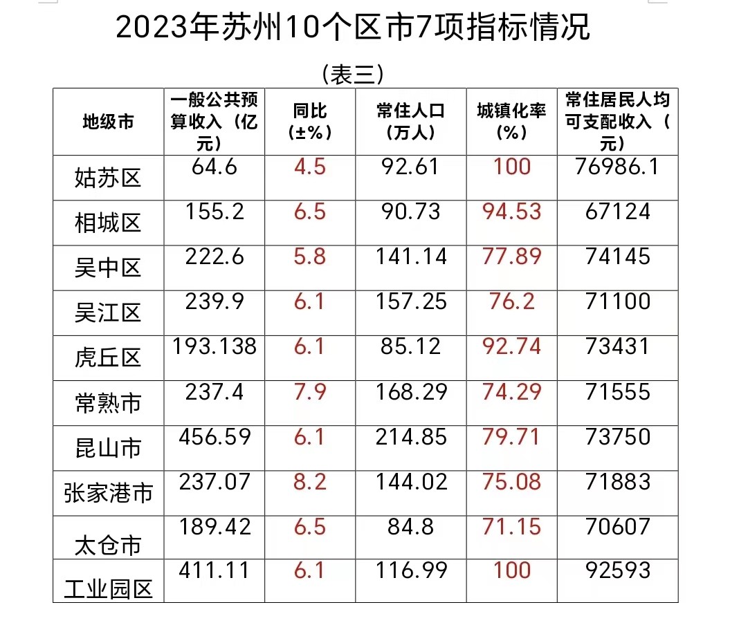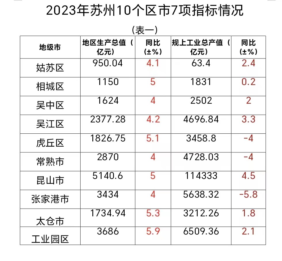 注:以上数据来自于苏州市及姑苏区、太仓市2023年国民经济和社会发展统计公报和虎丘区、吴中区、相城区、吴江区、工业园区、常熟市、张家港市、昆山市统计局统计数据。