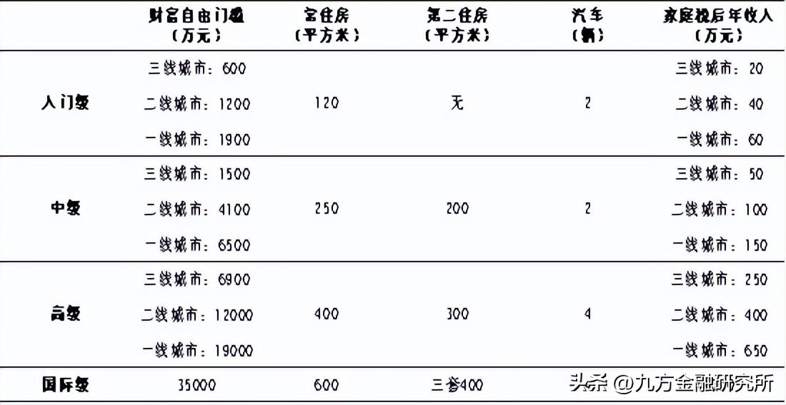 报告中,最受人注意的是一线城市财富自由门槛。入门级财富自由门槛是1900万元,主要包括一套120平米的市区常住房、2辆车、60万元的家庭税后年收入和800万元的金融投资;中级财富自由门槛是6500万元,主要包括一套250平米的市区常住房、一套200平米的郊区第二住房、2辆车、150万元的家庭税后年收入和1200万元的金融投资;高级财富自由门槛是1.9亿元,主要包括一套400平米的市区常住房、一套300平米的郊区第二住房、4辆车、650万元的家庭税后年收入和6500万元的金融投资。