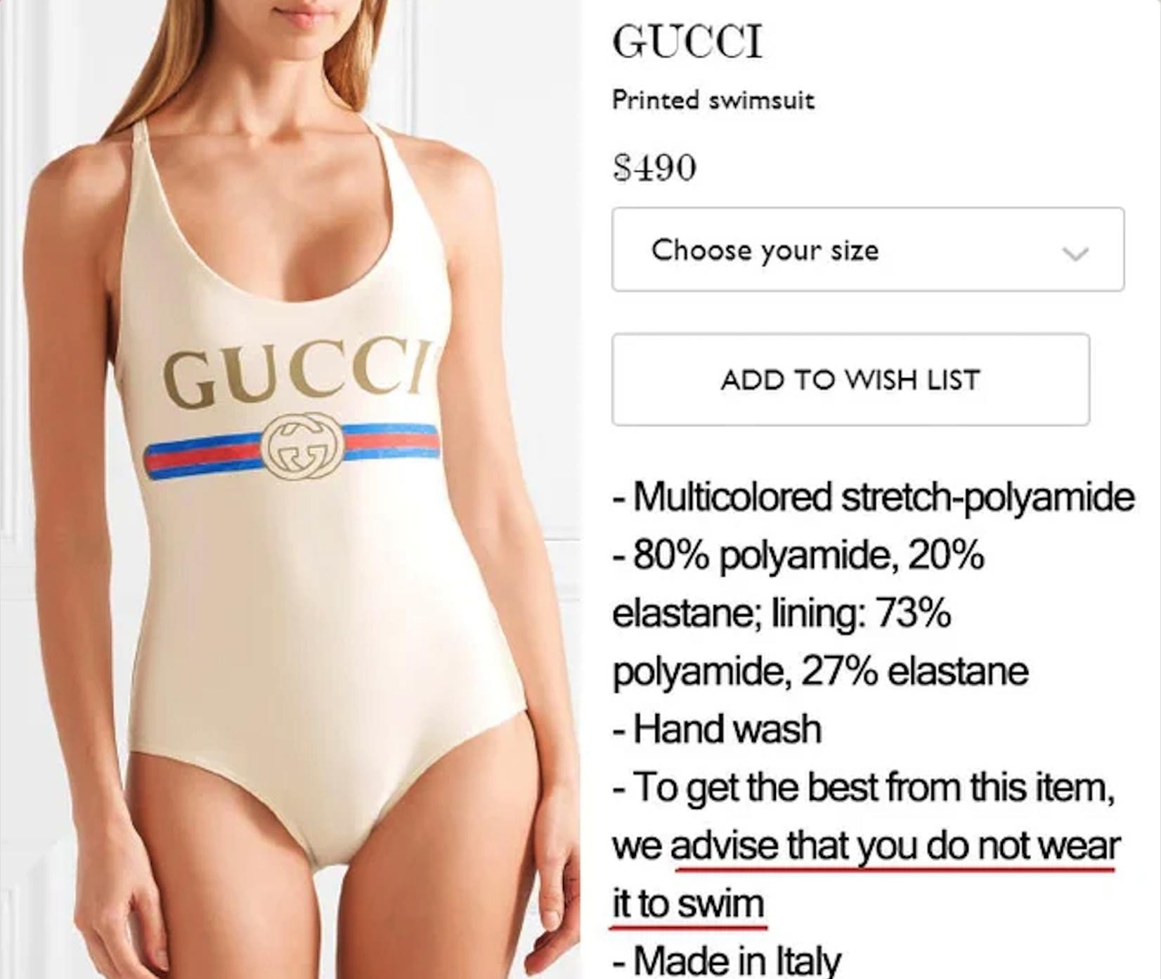 更为离谱的是,这一件泳衣被标注为不能游泳,因为衣服的材质是80%的尼龙以及20%的氨纶纤维,这些成分碰到水中的氯化物之后,会产生化学反应,导致衣料弹性下降。