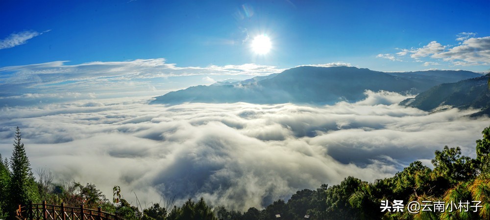 这次见到的海,无声无色,没有海浪拍岸的声音,海里也没有生命的存在,虽然偶有苍鹰瞬间掠过。这便是铺满茫茫哀牢群山间的云海,海的尽头便是天。天地寂然,是一种大气象的宁静。只是云翻雾卷,随风来去,在万里晴空耀眼的阳光下激荡,被风雕塑成浪花的姿态。抬眼望去,只是寂寞了远方浮出海面的点点青山。