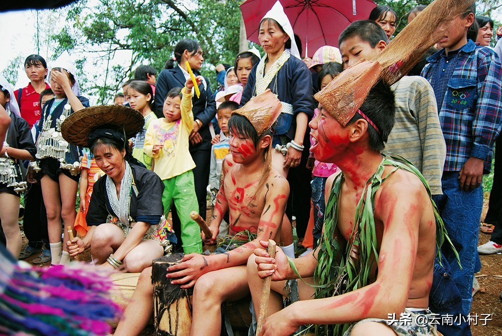 奕车风俗习惯有很多类似其他支系的哈尼族,都要过“十月年”、“苦扎扎节”、“插秧节”等,每个节日都会祭祀相应的神灵,比如最为狂欢的“苦扎扎节”,每年农历五月的第一个申猴日到子鼠日,历时五天。首日,寨子里男女老幼穿上新衣,杀猪宰牛,由贝玛主持祭祀,然后进山砍青松树作磨秋杆,一旦松树被选中便有了神性,松枝和松毛被一抢而光,当磨秋杆抬到村里,每个人都要摸一下以沾圣福。第二天支磨秋,各户男性家长在磨秋四周聚餐。等到第三天,就进入节日高潮了,邻里乡亲相互宴请,打磨秋、转秋、秋千。而最具奕车特色的是各村寨的串寨队伍,狂欢由此拉开序幕。应了那句老话,只有你想不到的,没有你见不到的,看奇装异服不要去巴黎,除了高档材料,都是大羊街的奕车人玩剩下的。头戴面具、身着兽皮,以油彩化装,以羽毛作饰。有的故意撕破衣衫,有的玩性别反串,串寨队伍浩浩荡荡,每过一村就掀起一次狂欢热潮。与城市迪厅里酒醉灯迷后的空不同,这种原始的狂欢是真正生的狂欢,真正的狂欢来自众生真实的喜悦,它直接引领你内心久已渴盼的冲动,走出心灵的牢笼徜徉在自由之中。