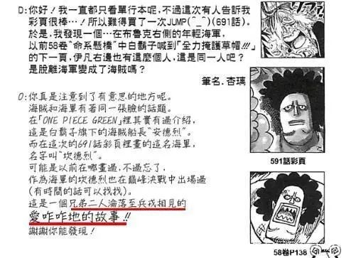 安德烈是中间那位爆炸头,曾经是白胡子团正式船员。他本人倒是没什么,但尾田在他身上摆了个大乌龙,不小心在海军里画了个一模一样的人,只能在SBS狡辩说爆炸头海军是兄弟坎德烈。