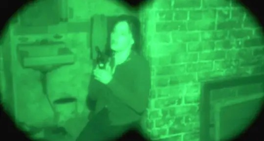 Clarice M还没有来得及掏出身上的配枪,野牛比尔就钻进了地下室。野牛比尔戴上了夜视仪,悄然贴在了Clarice M的身后,像是猫捉老鼠一般的变态地欣赏着女孩的恐惧。