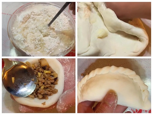 5、紧接着取一个剂子揉圆,按成小碗的形状,来一勺馅料,先捏成饺子,再捏好花边,放进蒸笼