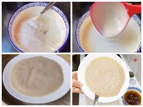 3、煮好后趁热倒入刚才做的米浆里面,一边倒一边用筷子搅拌,生熟浆就做好了,放一边晾至回温