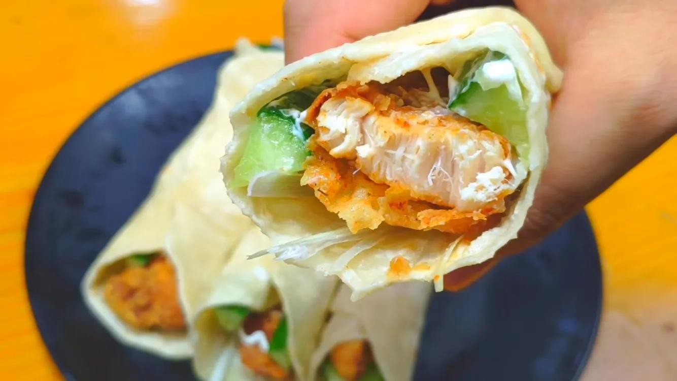 7、烙好的饼铺好,设点葱丝,黄瓜丝放上去,再放上鸡肉,挤上沙拉酱,卷起来完成