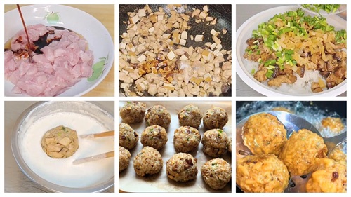 6、刚才炸好的豆米糊放入一勺盐搅拌一下,放入糯米团子裹满面糊