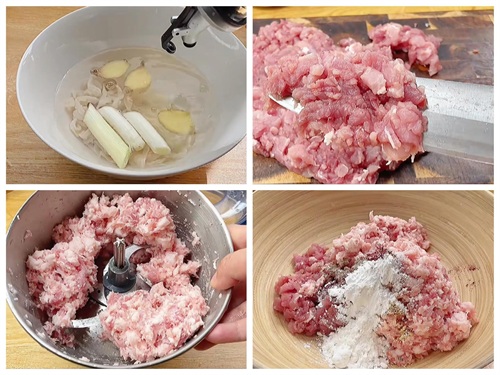 3、然后肥瘦放一起,加姜粉,盐,黑胡椒,蚝油,老抽,淀粉,顺着一个方向搅拌,期间可以加适量冰水,最终成黏黏的状态,这样做出来的很Q弹
