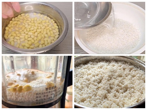 1、提前一天浸泡黄豆,大米和糯米,糯米分开泡,第二天将黄豆和大米淘洗干净,放进料理机,水量超过1厘米,打成细腻的米浆