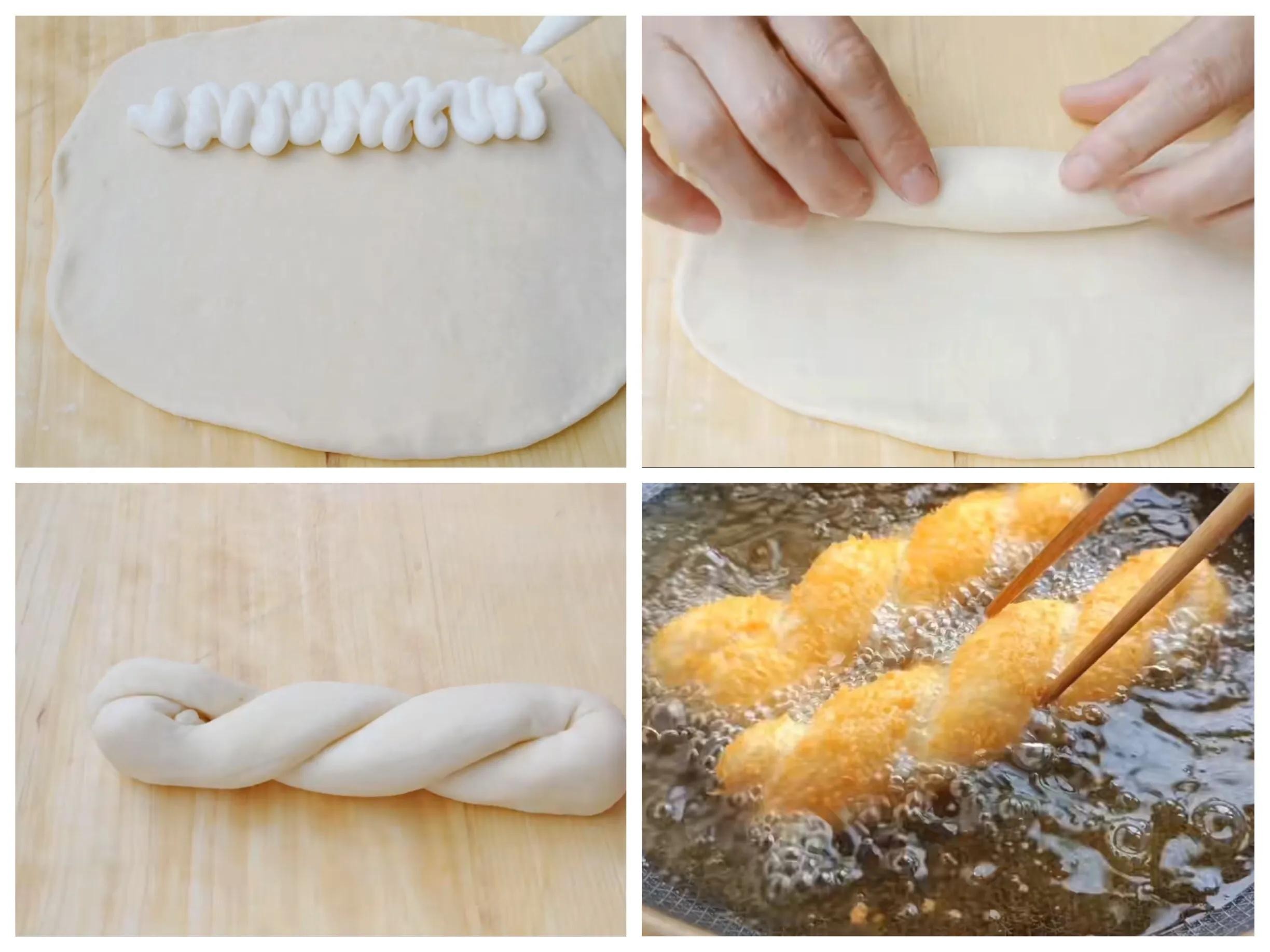 7、制作麻花辫,先搓中间部分,再搓两端,搓细后左右手往反方向搓上劲,两头对折捏住提起来就打结了,最后将接口处捏合,防止去锅散开