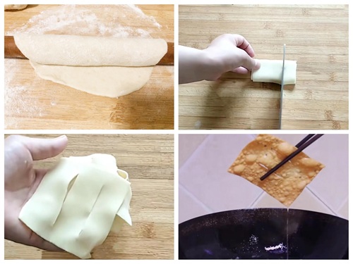 3、接着切成方形,取10片叠在一起对折,中间切2刀,油热后下锅炸至金黄色就可以了
