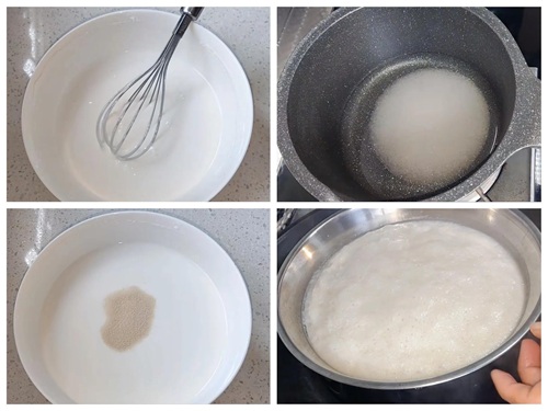 4、等到大概30度,摸起来不烫手时,加入酵母粉,搅拌看不到酵母颗粒,盖上保鲜膜发酵2倍大