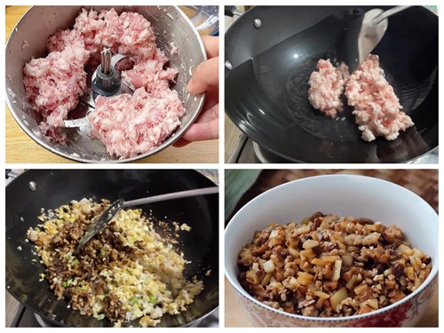 4、锅中倒油,下葱姜爆出香味,再下猪肉煸炒,炒至变色后倒入香干,香菇碎,加料酒,盐,糖,老抽,蚝油,鸡精,胡椒粉调味