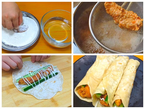 食材:2块鸡胸肉、大葱葱白、奥尔良腌料、面粉、黄瓜、沙拉酱