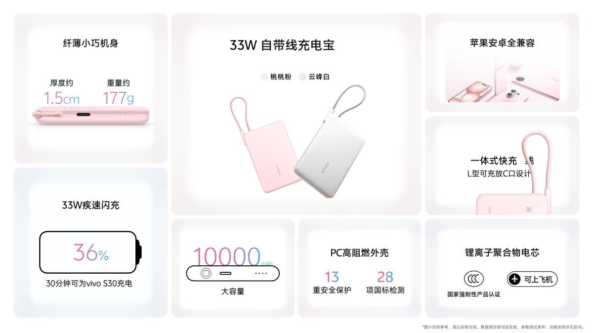 vivo 10000mAh 33W 自带线充电宝同期发布,上市价格129元,6月6日正式开售,6月18日前搭配S30系列手机组合购买仅需89元。vivo IoT产品更有全新推出的教育优惠,买平板送手写笔,手表、耳机、配件补上加补至高立减20%。