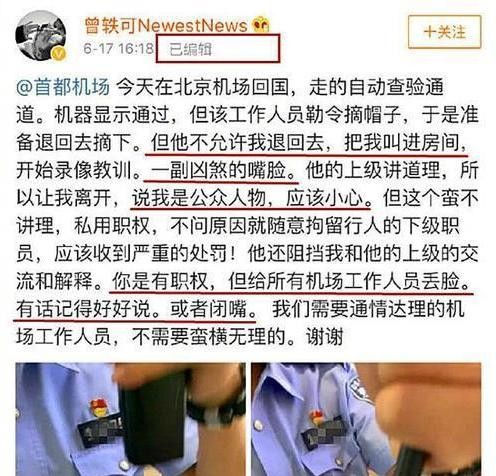 事情的起因是曾轶可在机场安检时拒绝接受正常的检查,民警要求其脱帽进行面相比对,她却拒不配合。不仅对民警爆粗口,甚至还将其发布至网络,引导舆论实施网爆,进行所谓的维权。