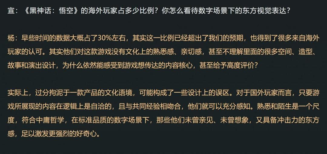 今年 1 月底,《黑神话》开发商游戏科学联合创始人兼美术总监杨奇做客中国美术学院举办的西湖论艺节目,对谈从游戏的故事、设计、美学、用户体验等角度展开。当被问到《黑神话》海外玩家占比时,杨奇透露大概占了 30% 左右,超出了预期。