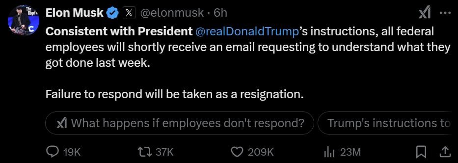 周六,一封标题为「你上周做了什么」的邮件发送给了美国联邦政府员工,要求他们在周一午夜之前回应,简要列出五个要点,说明上周的工作成果。有律师认为马斯克的行为是非法的,FBI 局长则提醒员工别回复。马部长加大了裁员力度,要求政府雇员解释他们的工作内容,否则将被解雇。