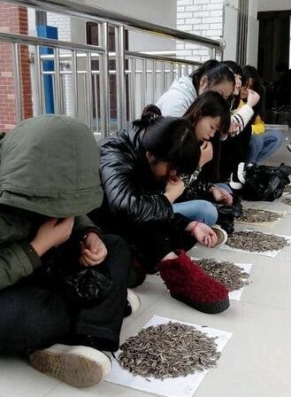 日前,一组多名学生坐在地上嗑瓜子的照片在网络热传,网友爆料称,这些学生来自湖南娄底卫生学校,因上课嗑瓜子被抓,班主任自掏腰包买了100斤瓜子“罚”他们嗑个够。昨日,该校办公室林老师向华商报记者表示,16名“受罚”学生只有一名嗑完,但他们都保证今后一定遵守课堂纪律。