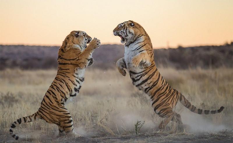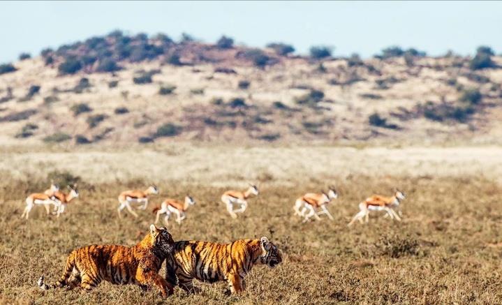 当老虎来到能风驰雷电的非洲大草原时,它们将释放出自己的全部能量,那时,才是真正大展拳脚的时候。以它们的高智商,看着狮子、鬣狗、野狗等食肉动物是群居生活后,老虎肯定也会逐渐向群居生活靠拢。