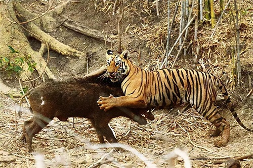 罗恩和朱莉两兄妹摒弃了老虎独居的习性,它们捕猎时,互相协作,常常能成功判断猎物逃跑的方向,直接跑到前方去围堵,或者一个追一个堵。就连平时敢和三四只狮子叫板的野猪,见到兄妹俩也没脾气,只能转身就跑,可野猪实在跑不过老虎,只能沦为食物。