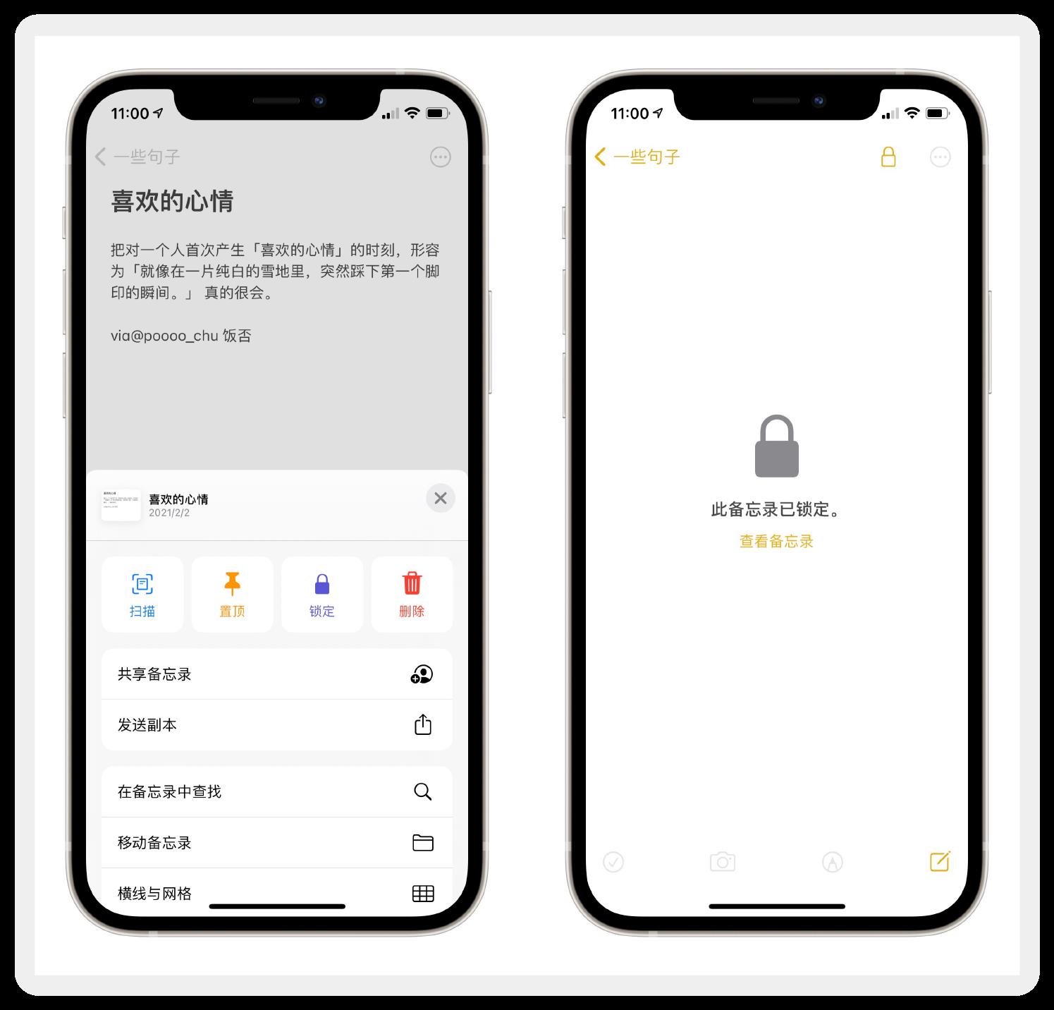 把自己“不可告人”的照片或文字放到备忘录里,点击右上角三个点,点击“锁定”,这条备忘录就只有你本人能打开了。