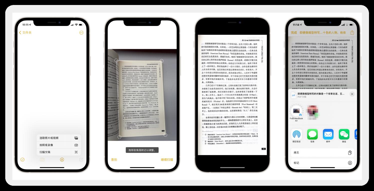 iPhone 备忘录还是一个免费又好用的文档扫描仪。新建备忘录后点击下方的相机 icon,单击“扫描文稿”,即可把纸质文章转为 PDF 电子文档,并通过微信、邮件等方式分享。
