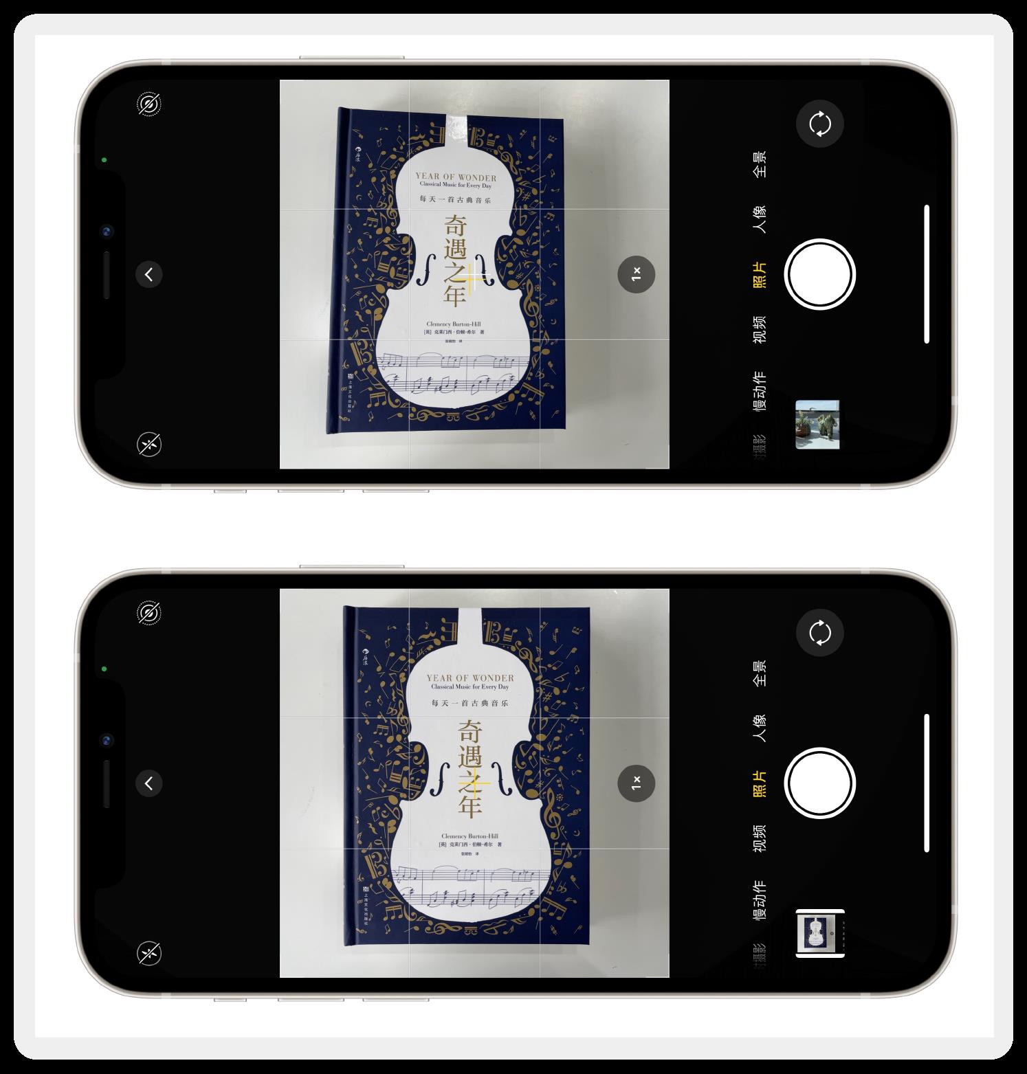 在打开网格的情况下,俯拍时取景器会显示白色、黄色两个十字标识。当两个十字标识重合时手机处于水平位置,这样拍出来的照片才好看。