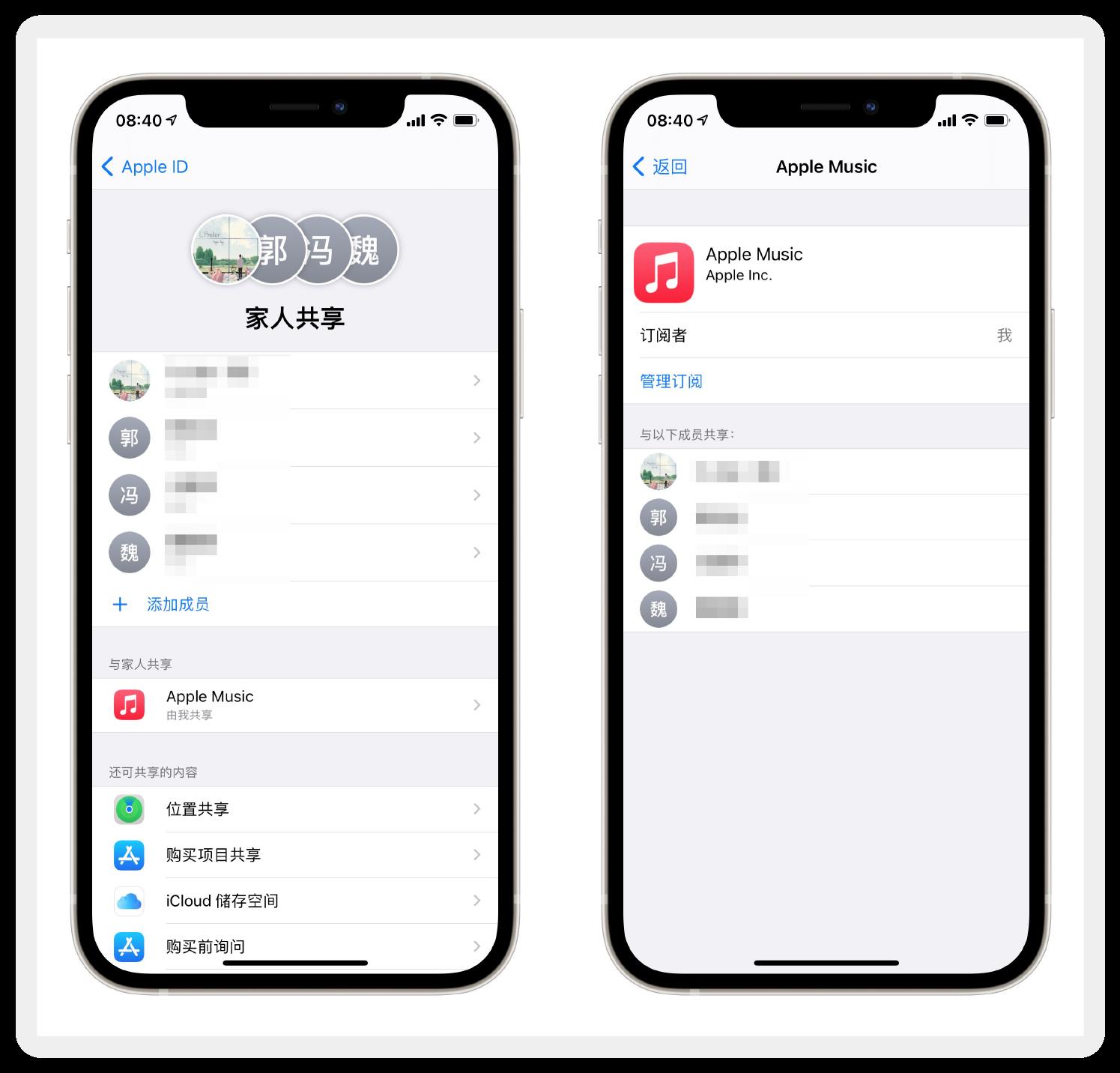 在“设置-头像-家人共享”中,可以建立自己的“家庭”,并通过 Apple ID 邀请其他人成为自己的家庭成员。家庭成员间可以共享 iCloud 存储空间(需购买)、位置信息和付费 App。